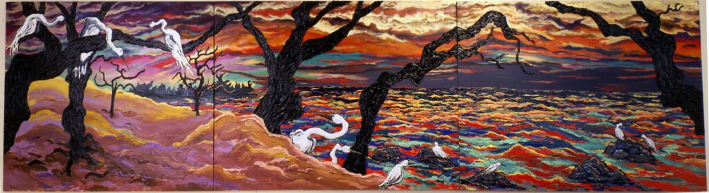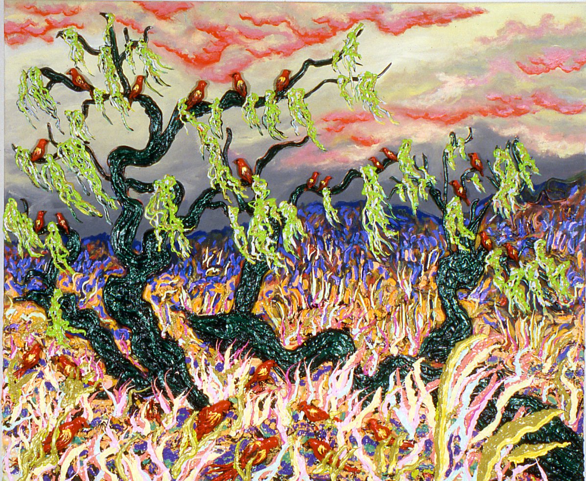 The artwork at The Retreat was all done by local artist Nina Beall. Guests will see large and small works throughout the property, and there are small gift items with reproductions as well as artist’ studio! Here’s what she says about her work and why she chose Austin after exhibiting internationally, and living in Chicago following grad school there and establishing herself as a professional artist: “As a native Texan, I was drawn to the Austin area and its quiet, peaceful environment with rolling hills, incredible views for miles, abundance of large shade trees, waterways, and spring fed creeks. As an artist and painter for most of my life, the area seemed ideal for building my home and studio in a style that fit with the environment to be productive and inspired. Inspired by the contrasts of nature, and the hill country, the dwellings are designed with references to the Arts and Crafts architectural movement, with focus on nature, Texas vernacular, and easy access for traveling elsewhere to other areas that inspire my work.”